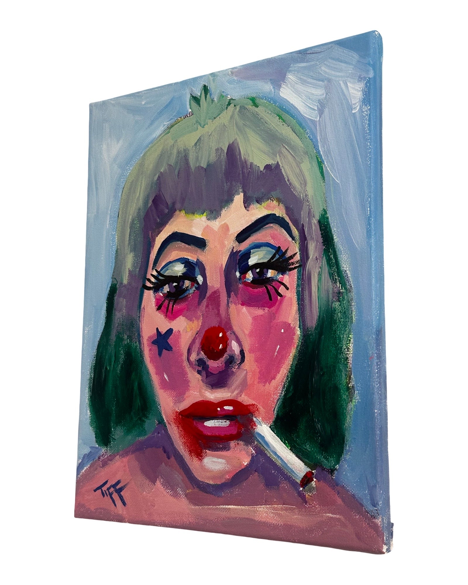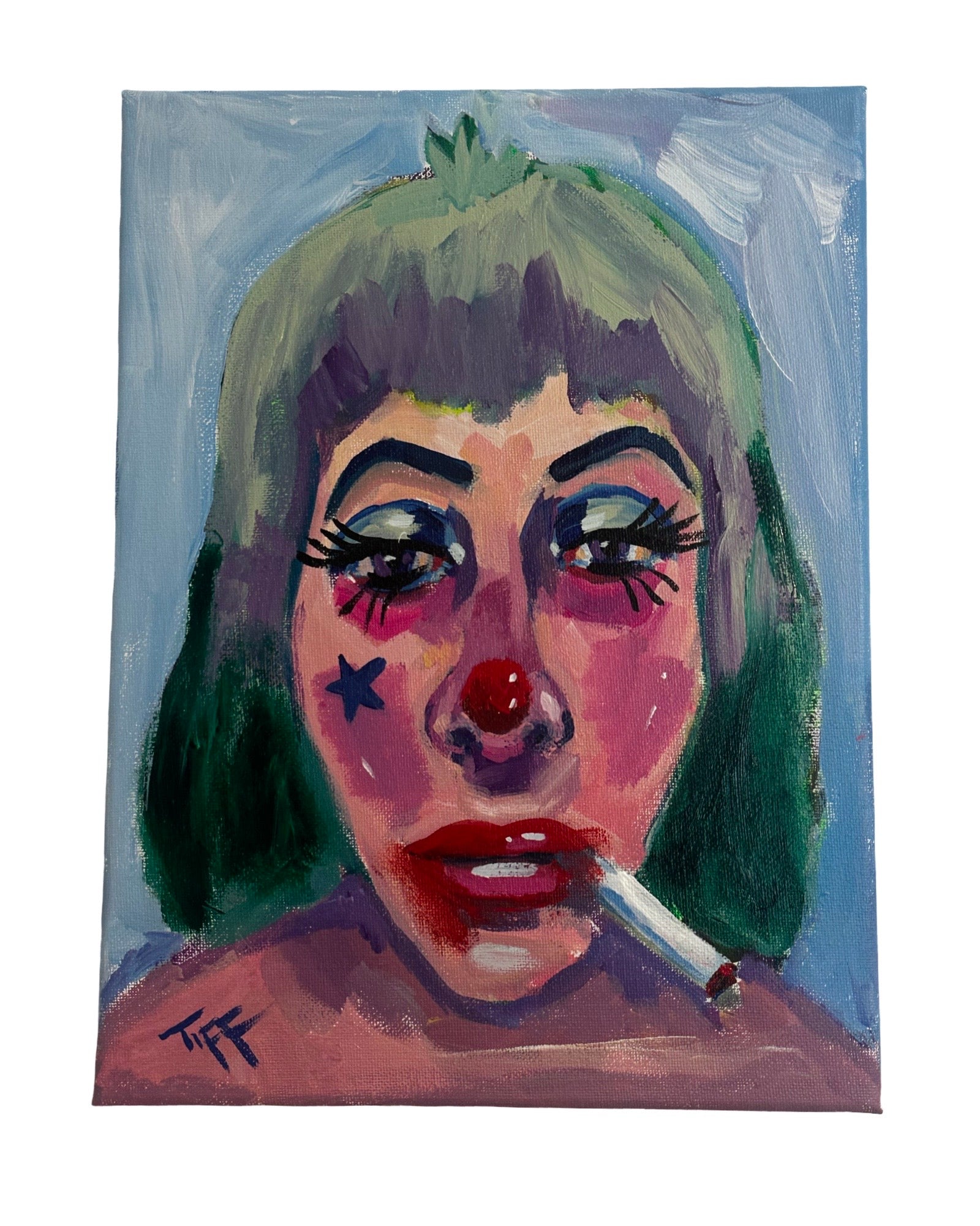 Crashout Clown bursts onto the scene with vibrant colors and bold expression, capturing TIFF’s fearless spirit in confronting past and present stories. This playful piece invites you to join her in a lively dialogue of letting go, speaking out, and turning life’s chaos into captivating art. Perfect for those who celebrate honesty wrapped in a splash of color.