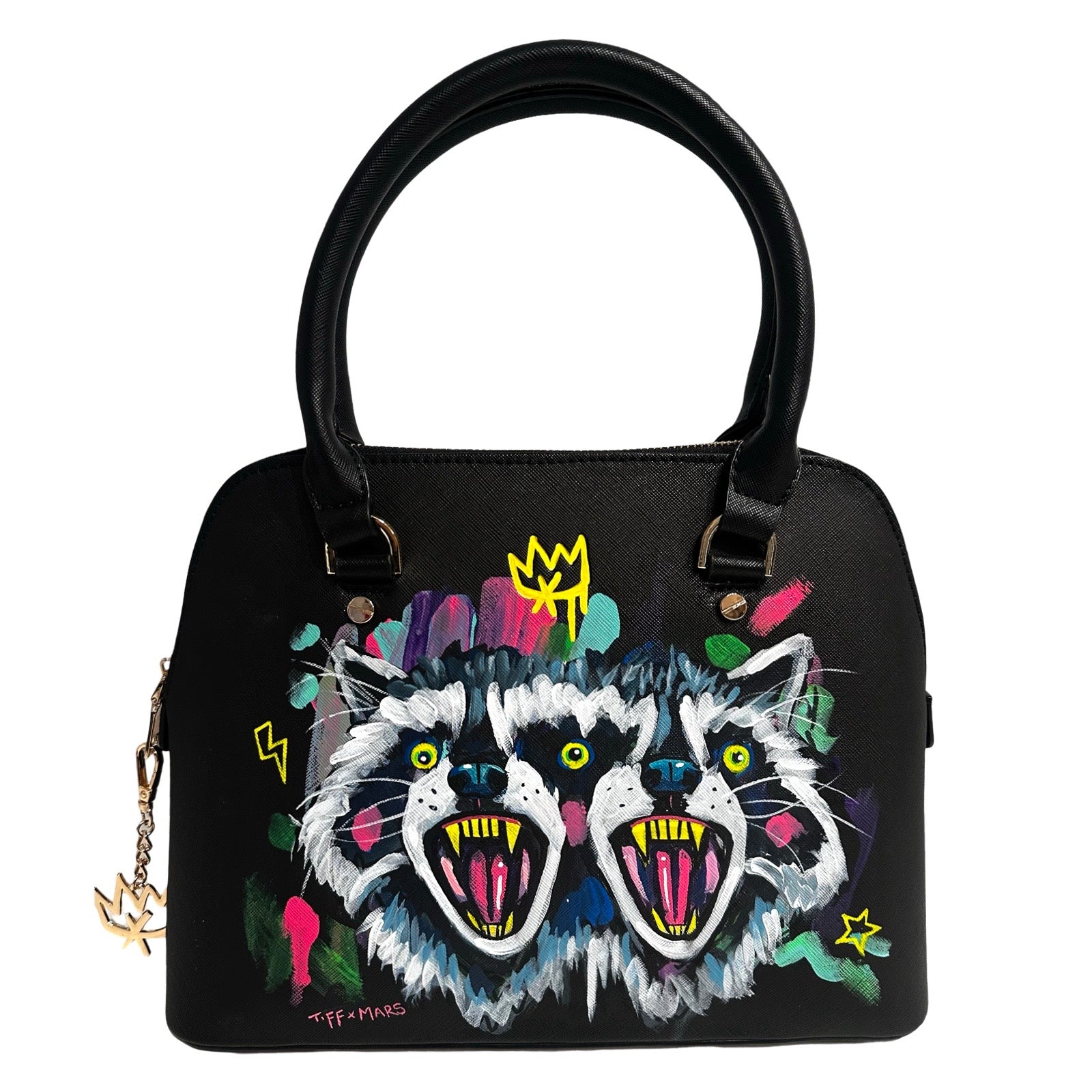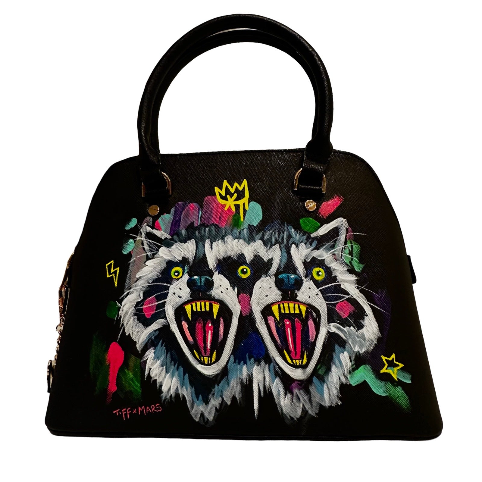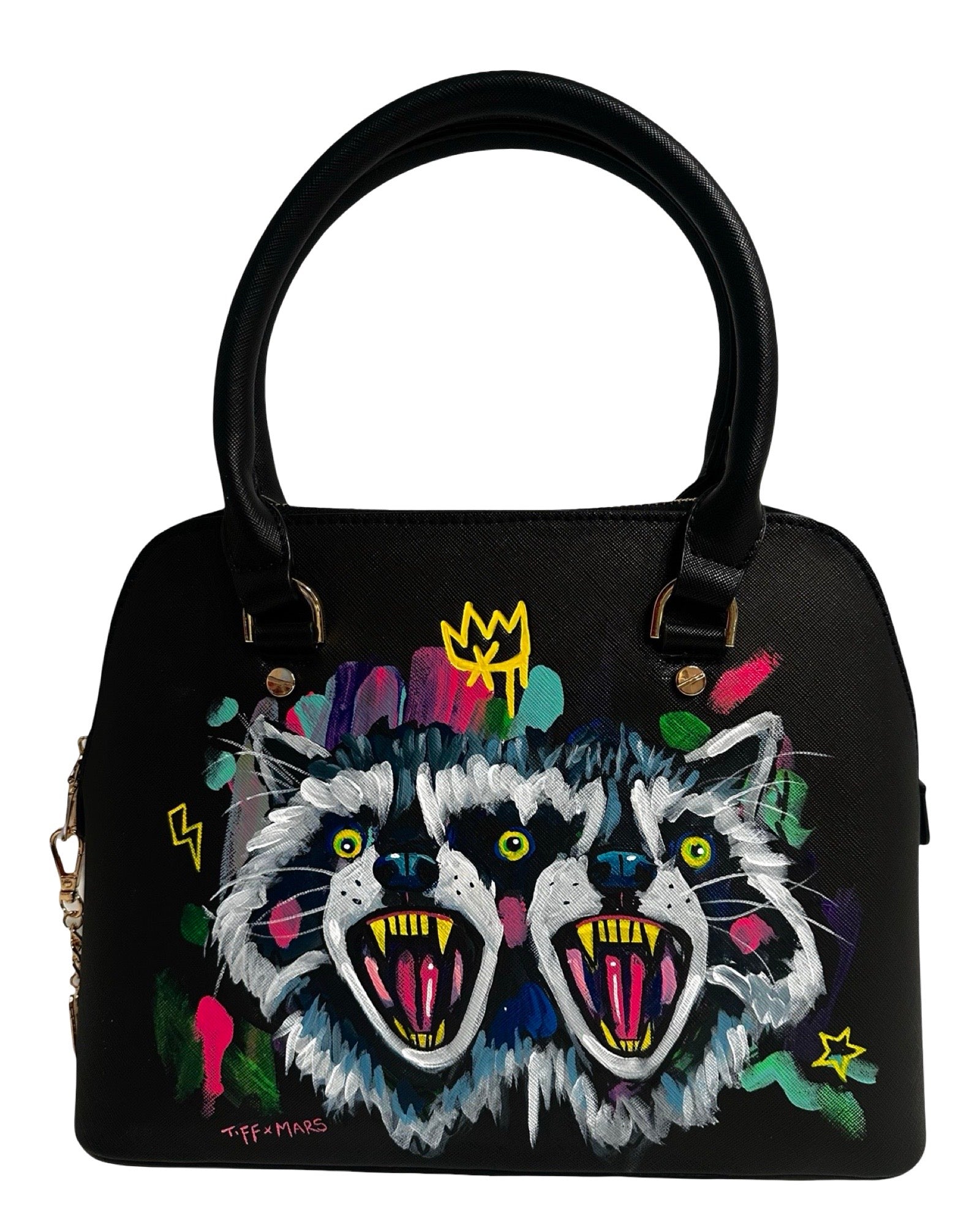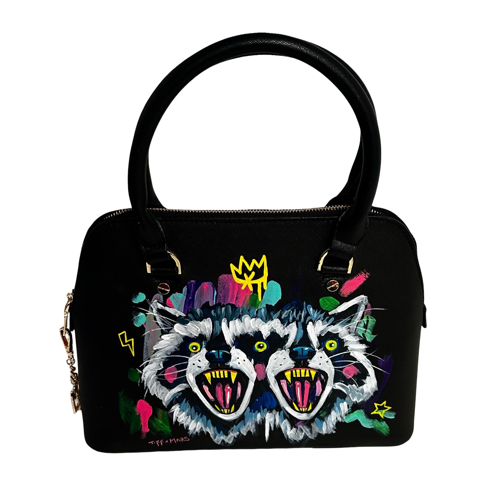 Meet the Dynamic Duo—a fearlessly funky hand-painted raccoon bag that's anything but ordinary. This vibrant two-headed creation features an underpainting by three-year-old Mars, with the rest brought to life by TIFF's artistic vision. Bursting with bold colors and unapologetic personality, this bag celebrates the creative magic that happens when a parent and child collaborate. Perfect for anyone who refuses to blend in and loves wearing art that tells a story. Loud, colorful, and utterly one-of-a-kind.