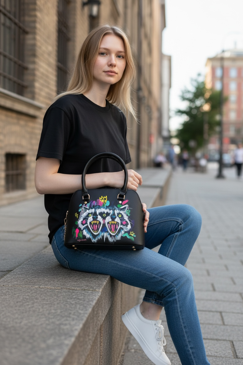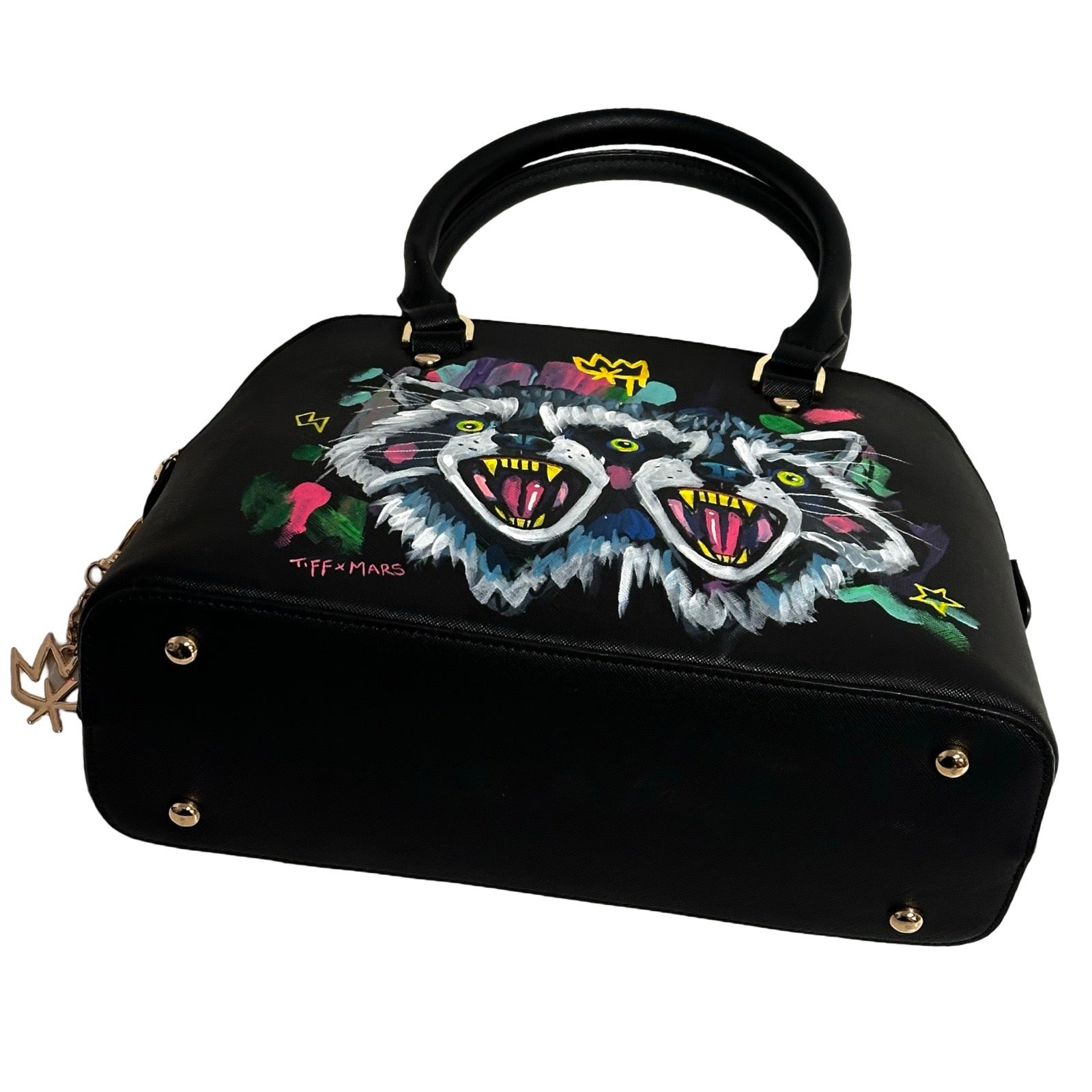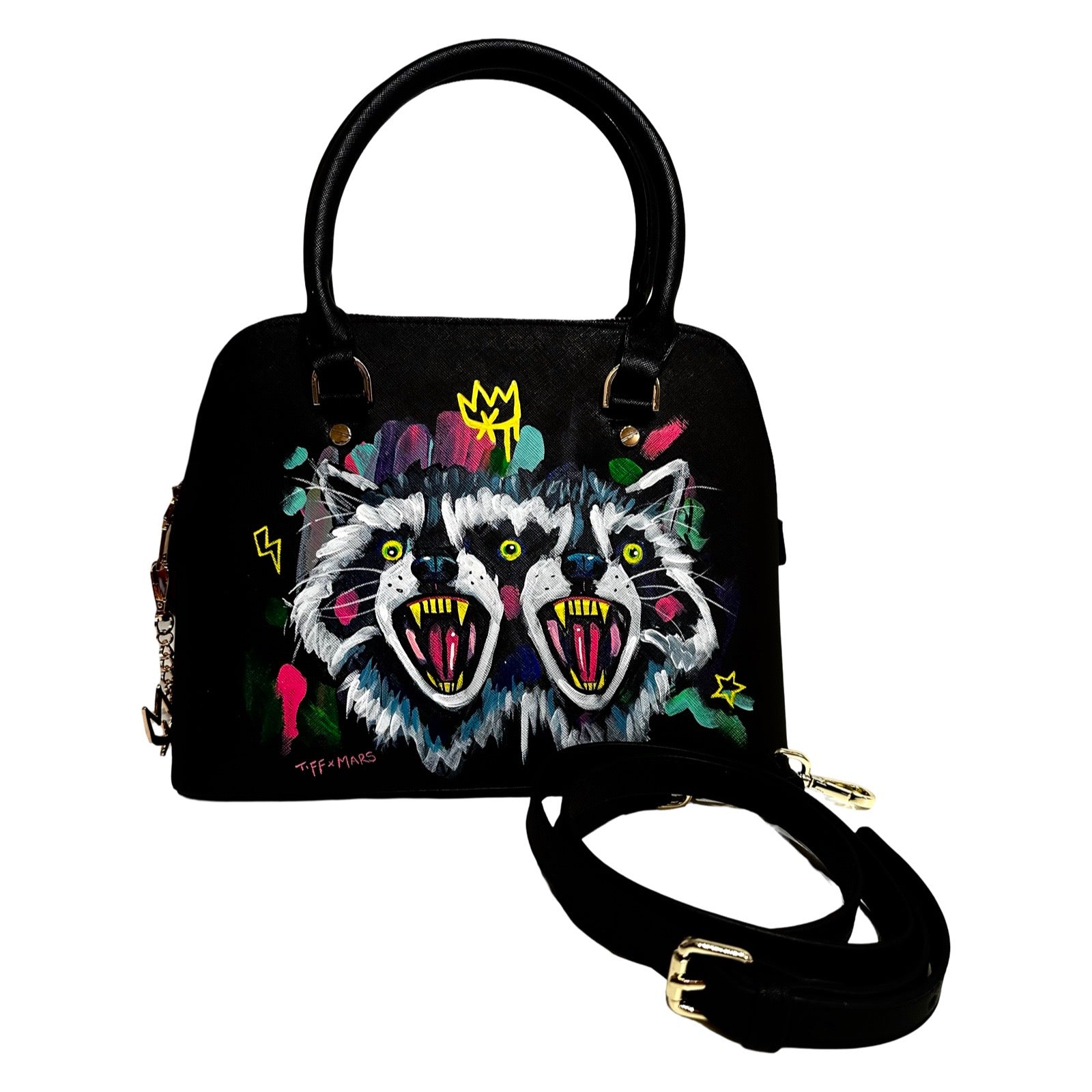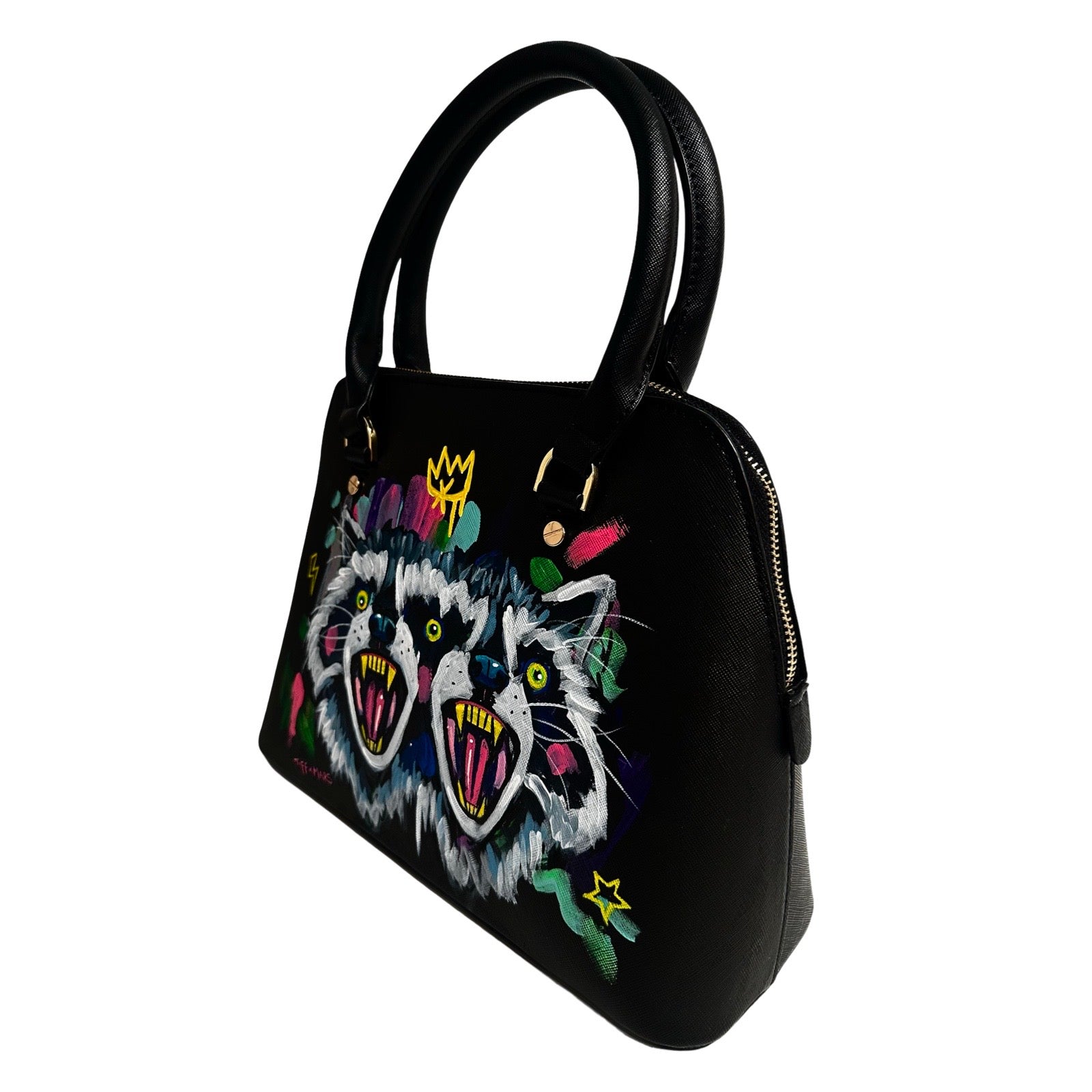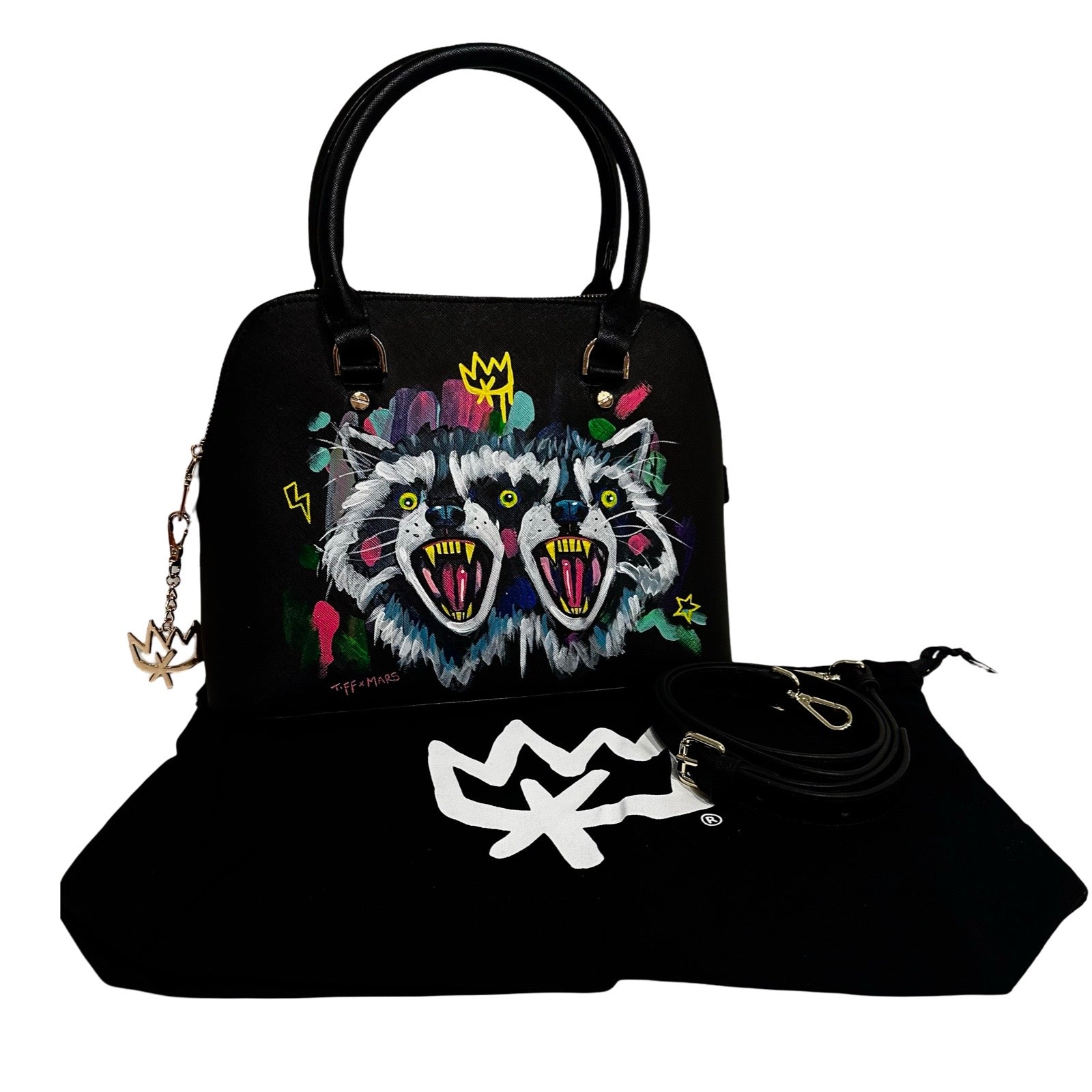 Meet the Dynamic Duo—a fearlessly funky hand-painted raccoon bag that's anything but ordinary. This vibrant two-headed creation features an underpainting by three-year-old Mars, with the rest brought to life by TIFF's artistic vision. Bursting with bold colors and unapologetic personality, this bag celebrates the creative magic that happens when a parent and child collaborate. Perfect for anyone who refuses to blend in and loves wearing art that tells a story. Loud, colorful, and utterly one-of-a-kind.