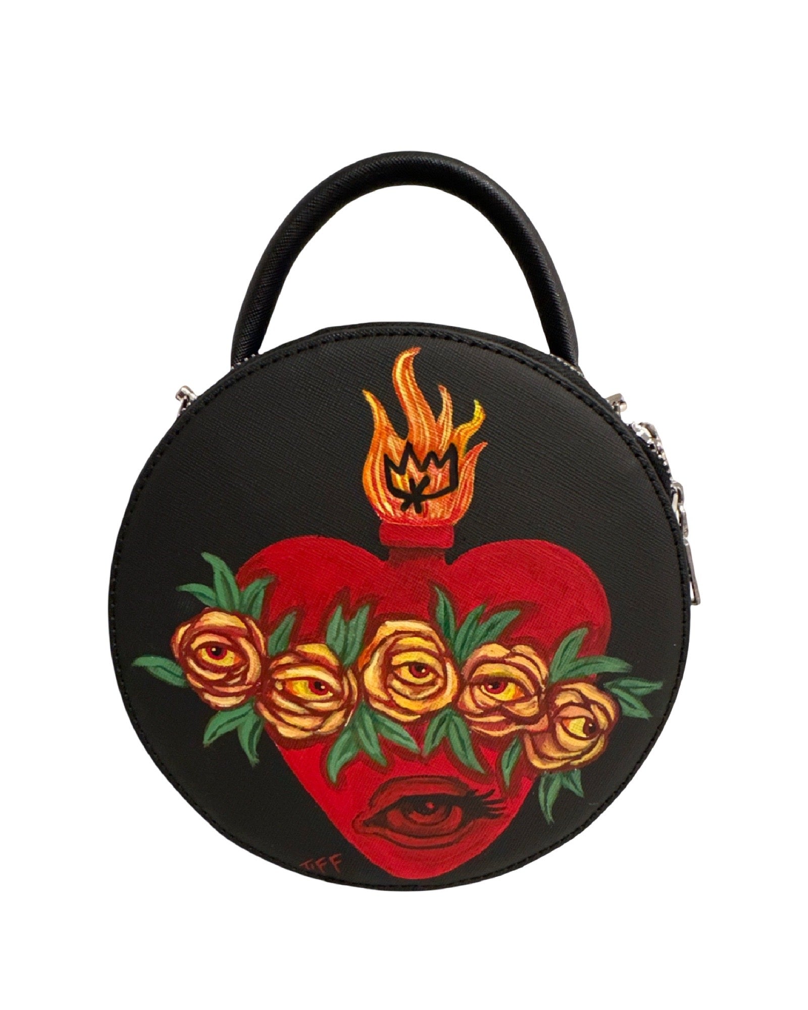 Get ready to turn heads with our Eye Love You bag! Featuring a unique spin on the iconic Sacred Heart design, this hand-painted Bomb bag is a statement piece that will make your heart skip a beat. Perfect for those who love to stand out and have a little fun with their fashion.