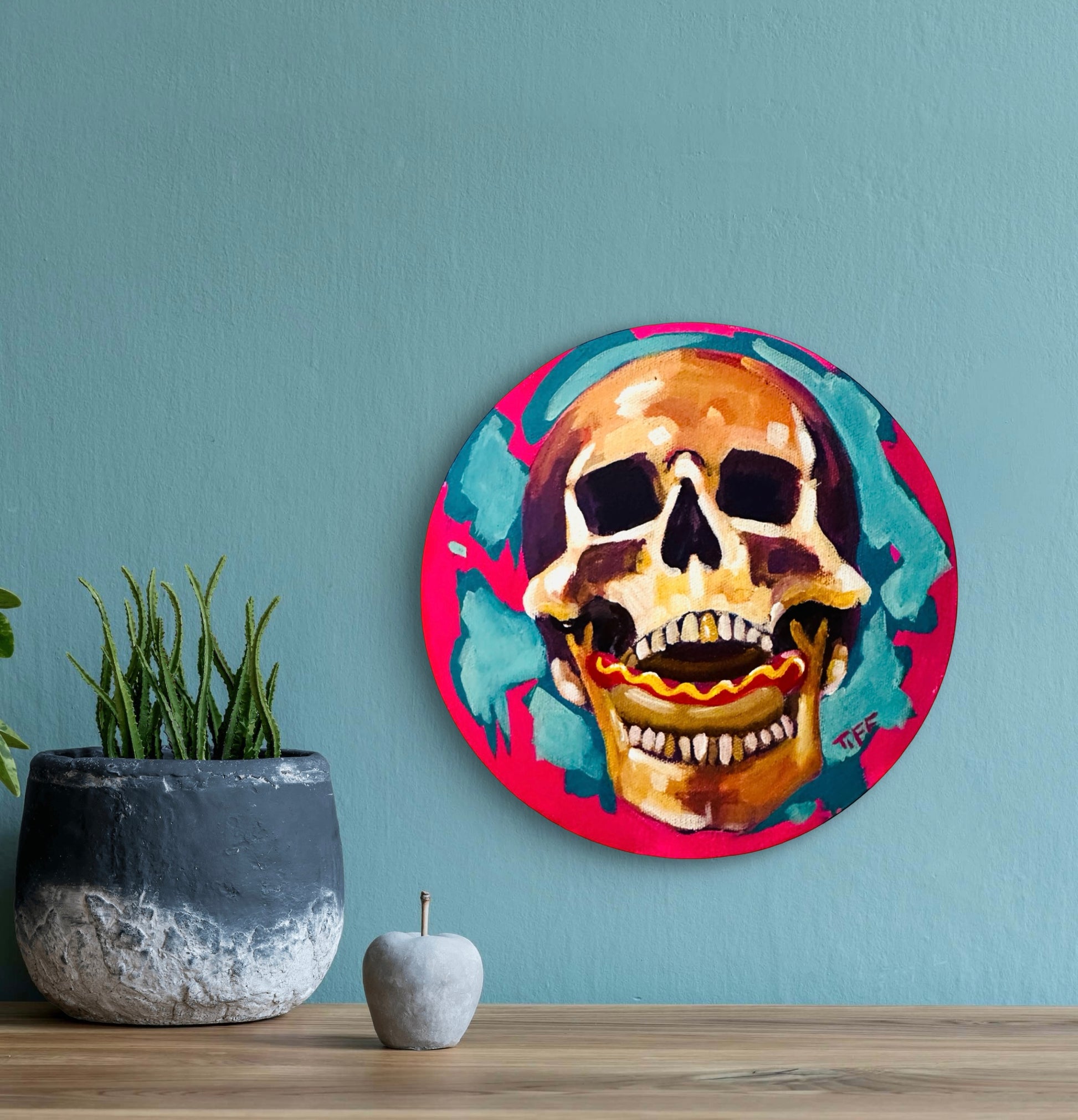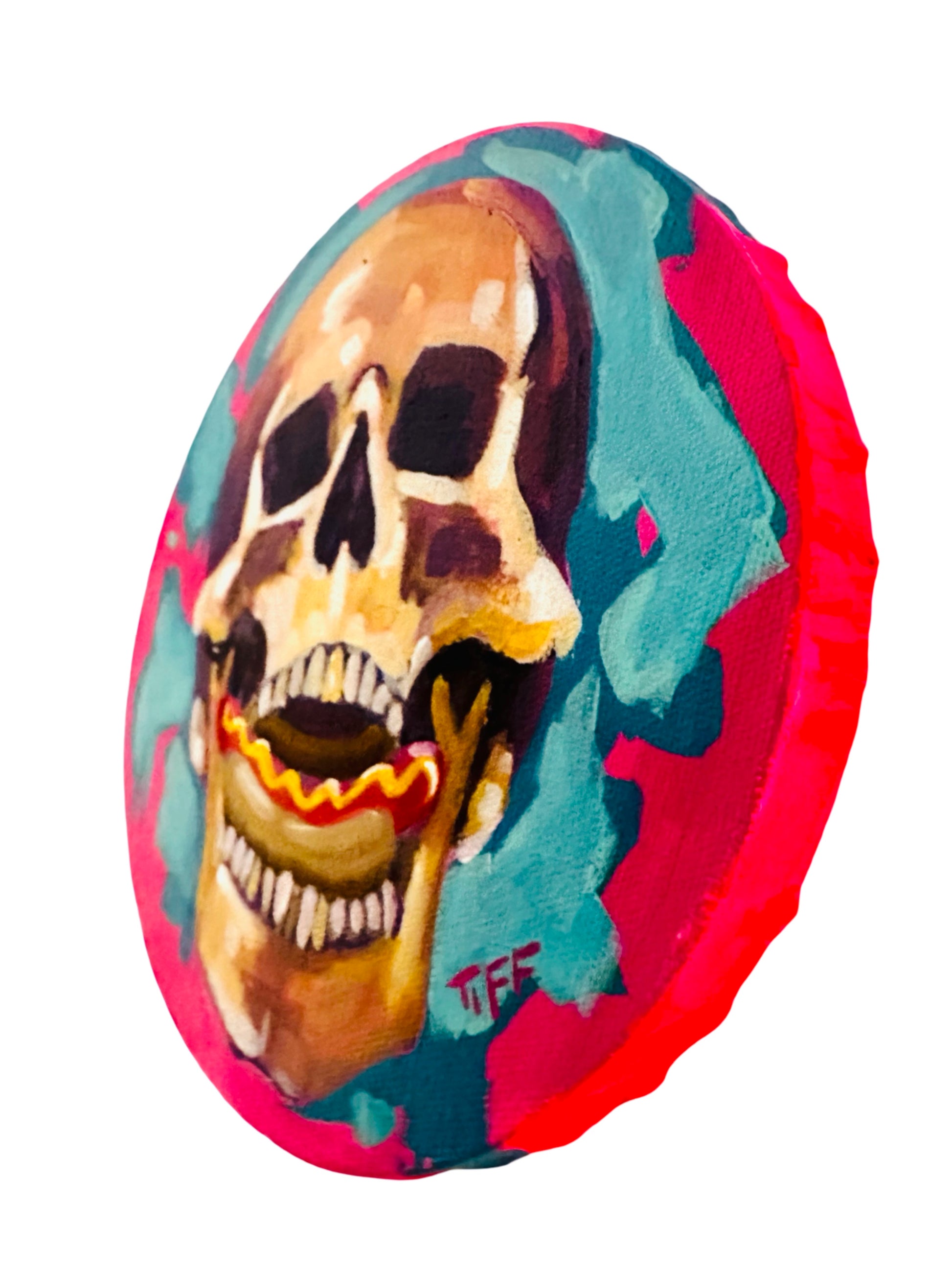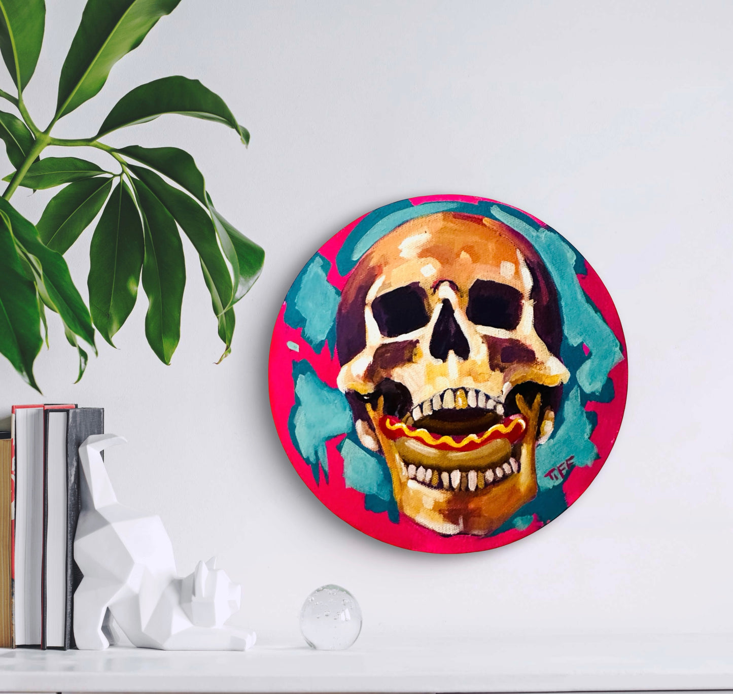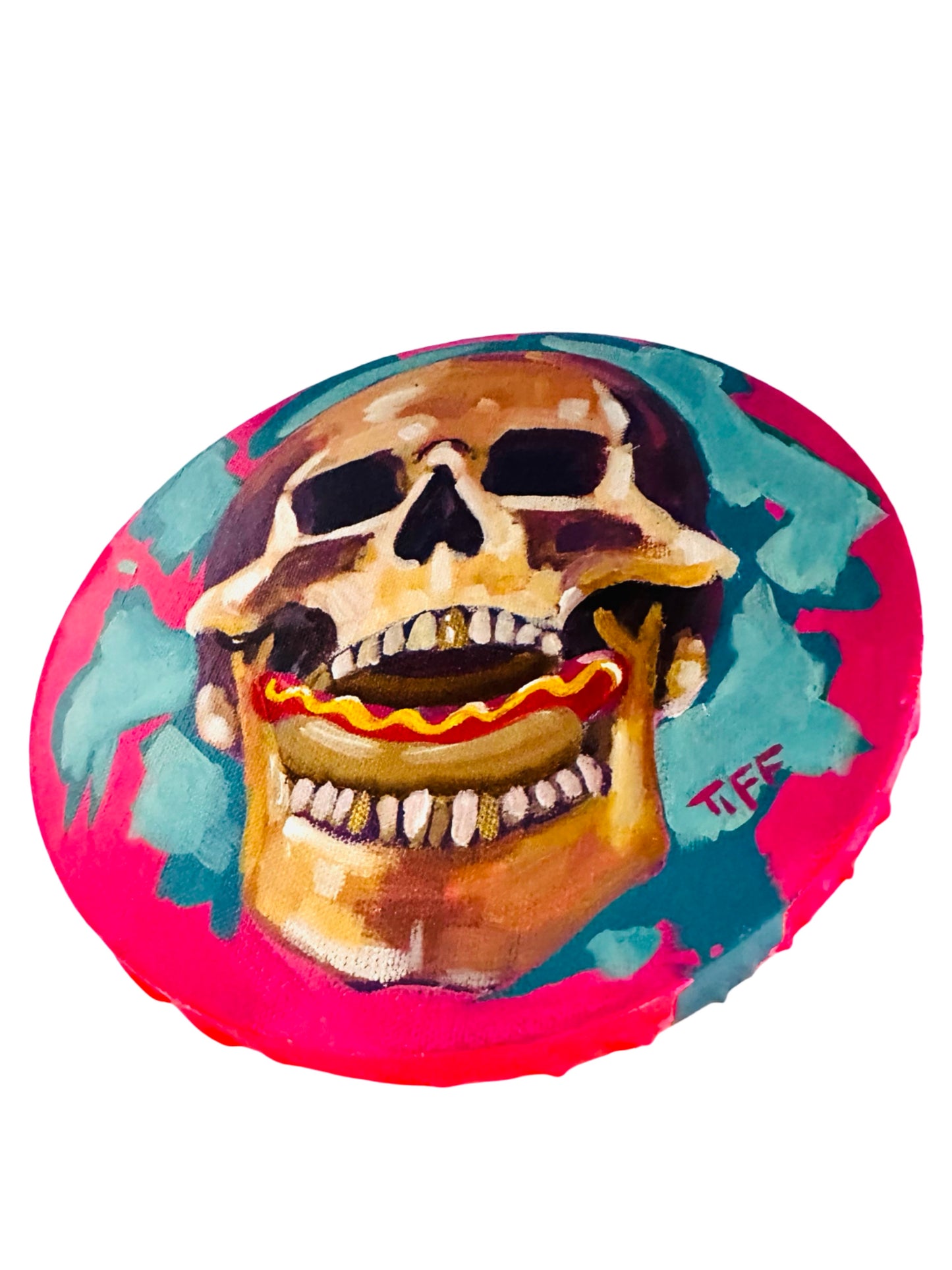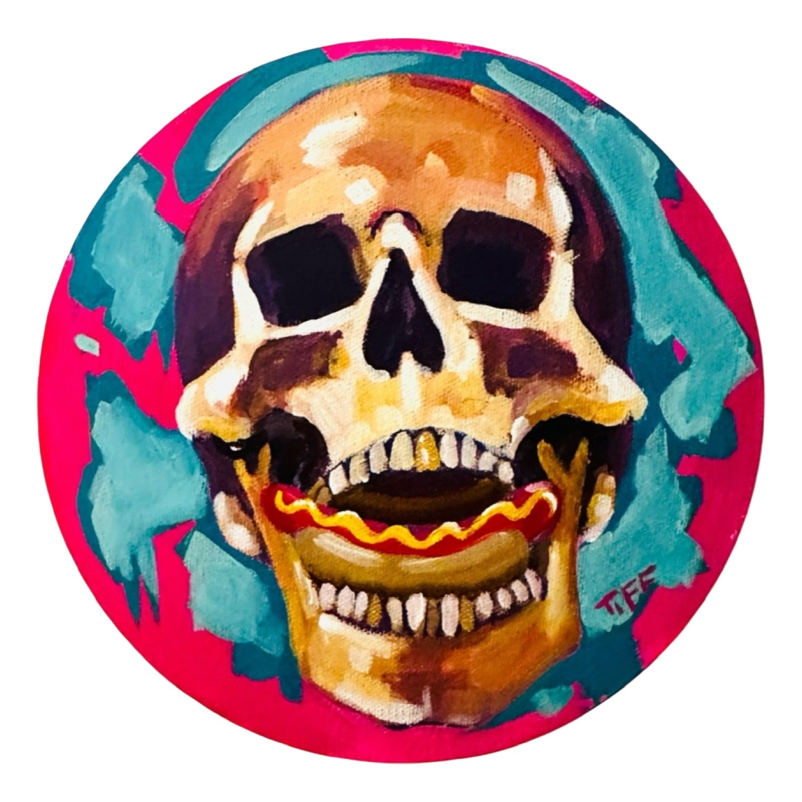 Celebrate fun and flair with "Hot Dawg!"—a vibrant painting that blends skulls and mustard dogs in a playful, cheerful design. Perfect for adding a quirky pop of color and personality to your home decor, this artwork brings a lighthearted twist to any space. Bright and bold, it’s sure to spark smiles and start conversations wherever it’s displayed.