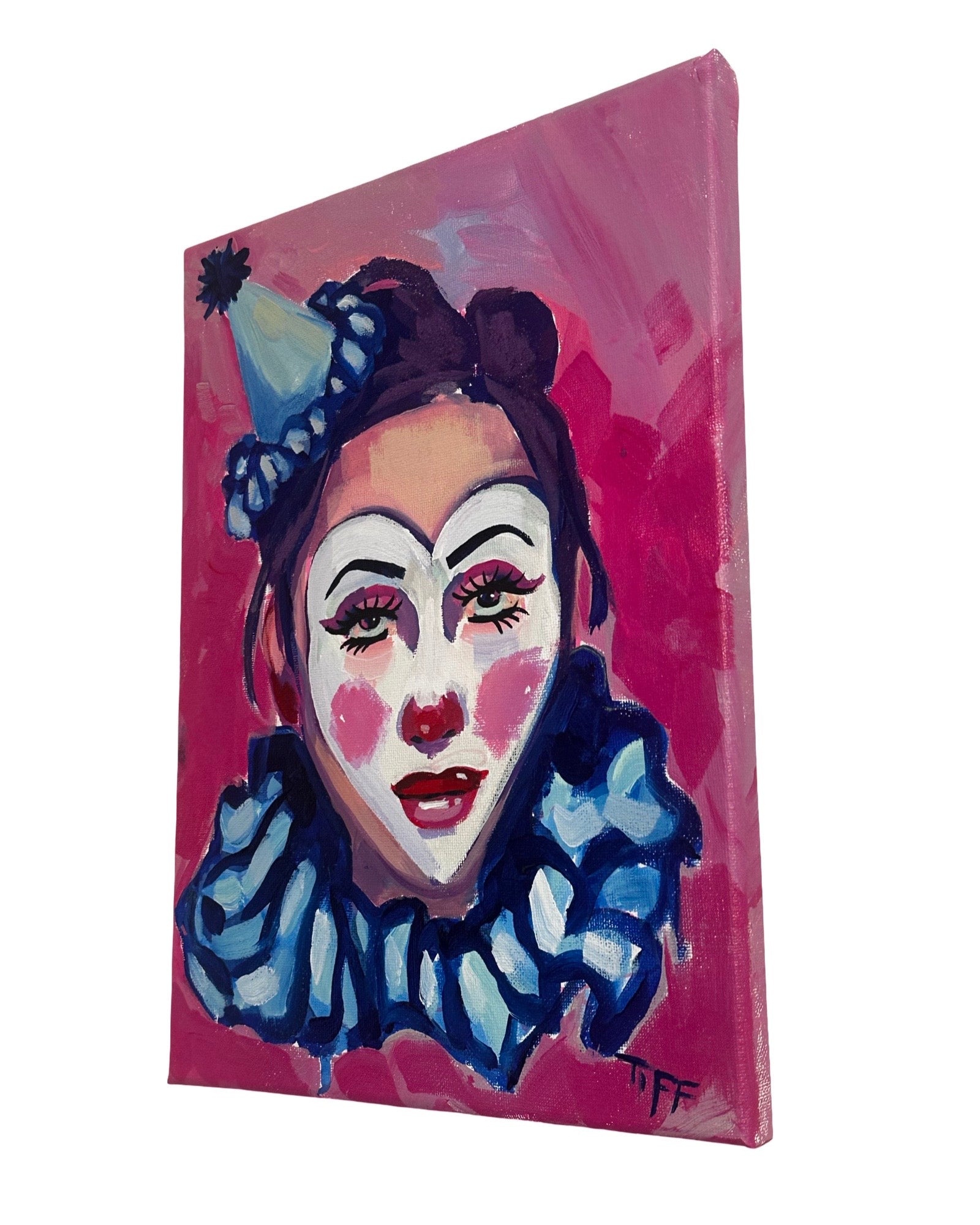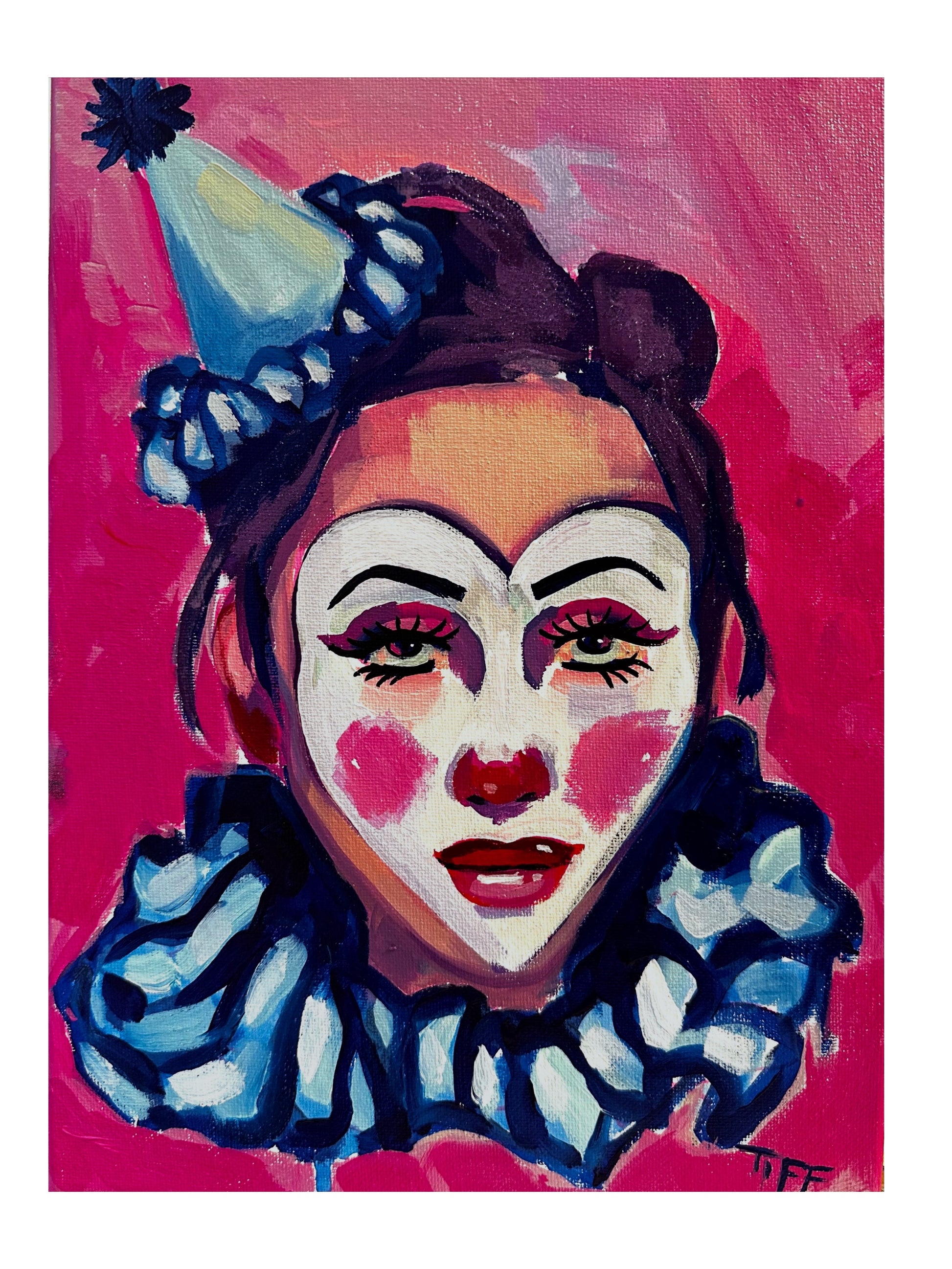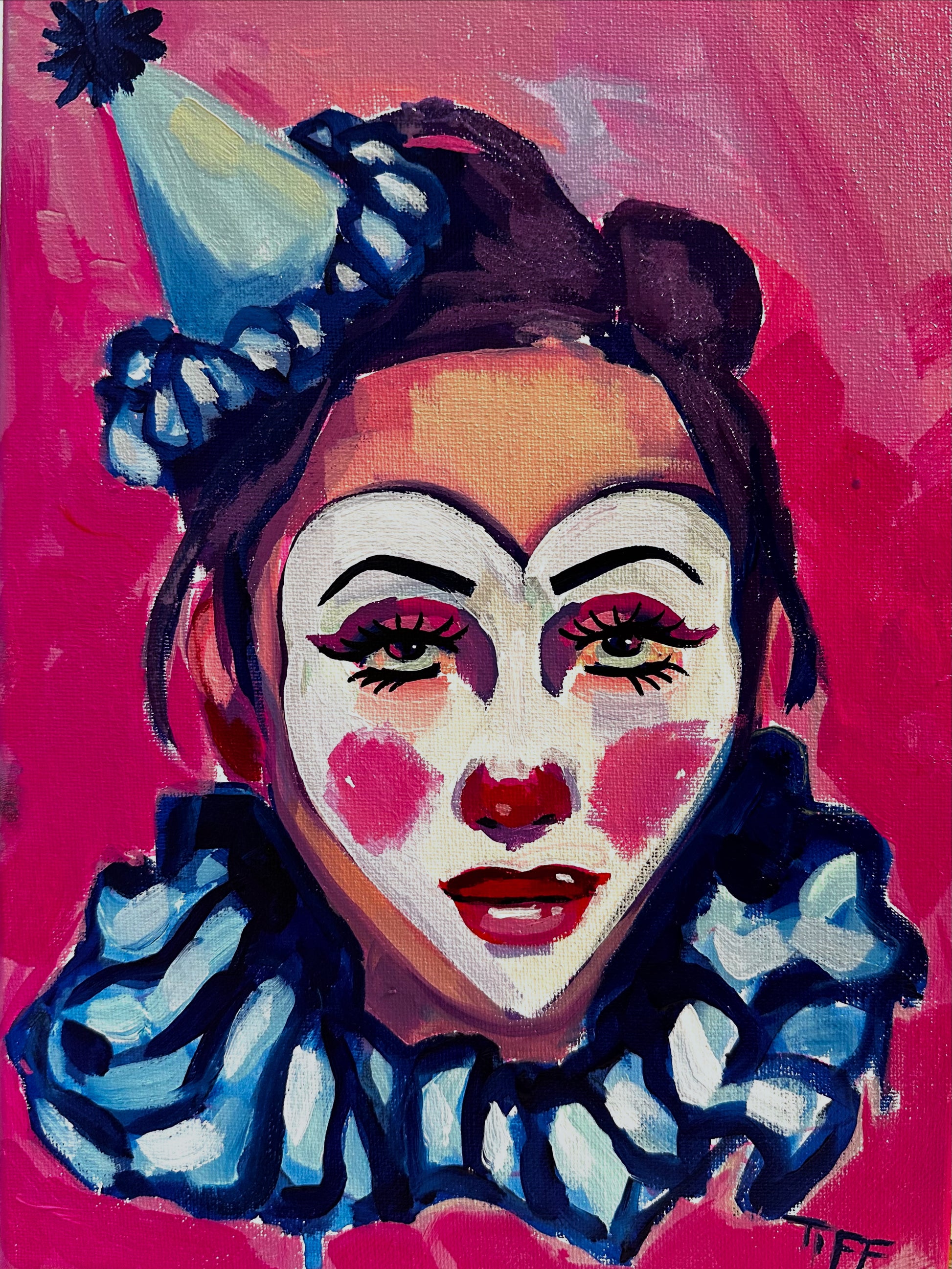 This charming clown painting captures a playful spirit, brought to life with the help of TIFF's three-year-old daughter, Mars. With a dash of purple glitter sparkling in her hair—added by Marleaux—this piece is both cute and a little moody, perfect for adding a whimsical touch to any space.